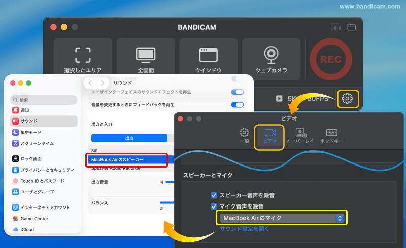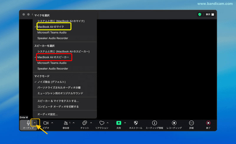 - マイク設定: Bandicam for MacとZoomの両方で、同じマイクを選択します。(ここでは「Macbook Airのマイク」を選択)
